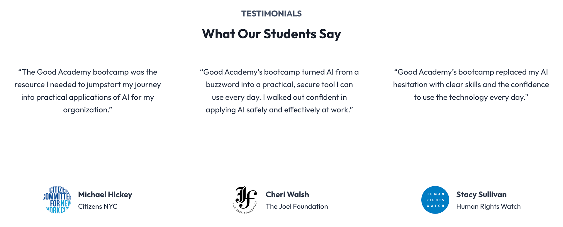 Good Academy is an AI education provider focused on empowering nonprofits and mission-driven organizations. Built on the core values of empowerment, accessibility, practicality, ethics, and curiosity - Good AI Academy is currently in its alpha stage and is focused on understanding client needs and exploring program structure. While currently offering three-week online synchronous bootcamps with live instructors, the organization's long-term vision is centered on developing an asynchronous online learning product in partnership with Charming Robot, a NYC-based design agency.