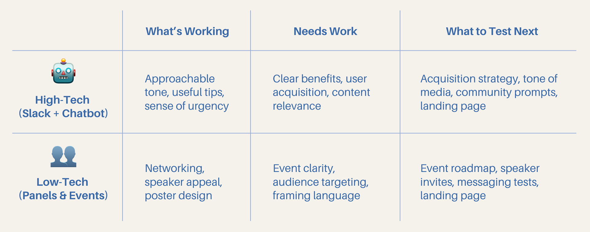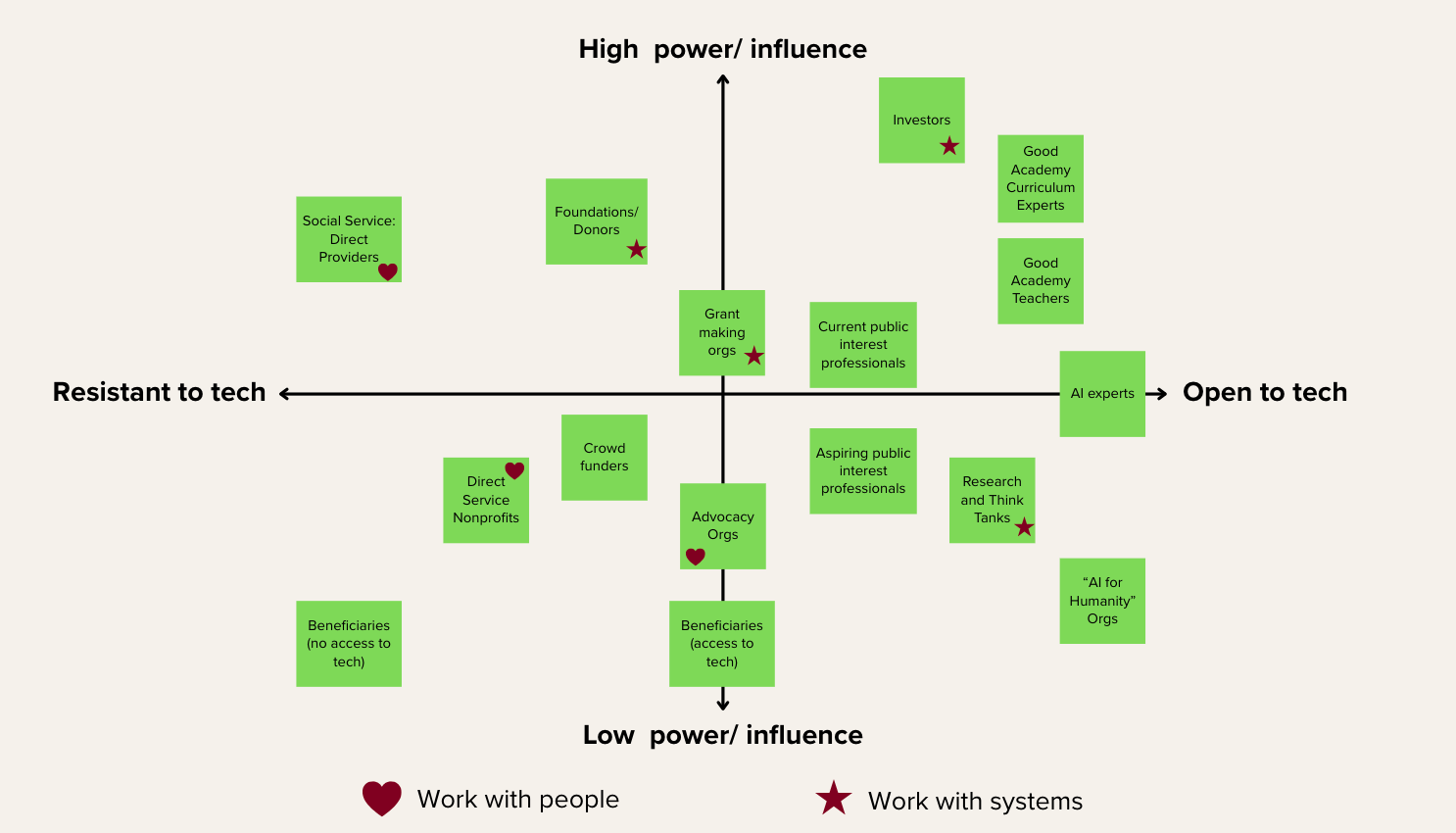 A low-resource, high-impact ecosystem that gives nonprofits what they need: community and hyperspecific insights. Drawing inspiration from existing tech communities like All Tech is Human, we’re aiming to build a a self-reinforcing system/cycle that turns AI skeptics into advocates.