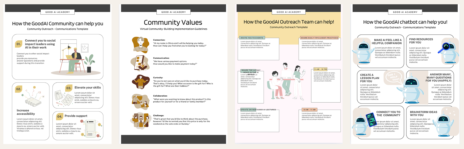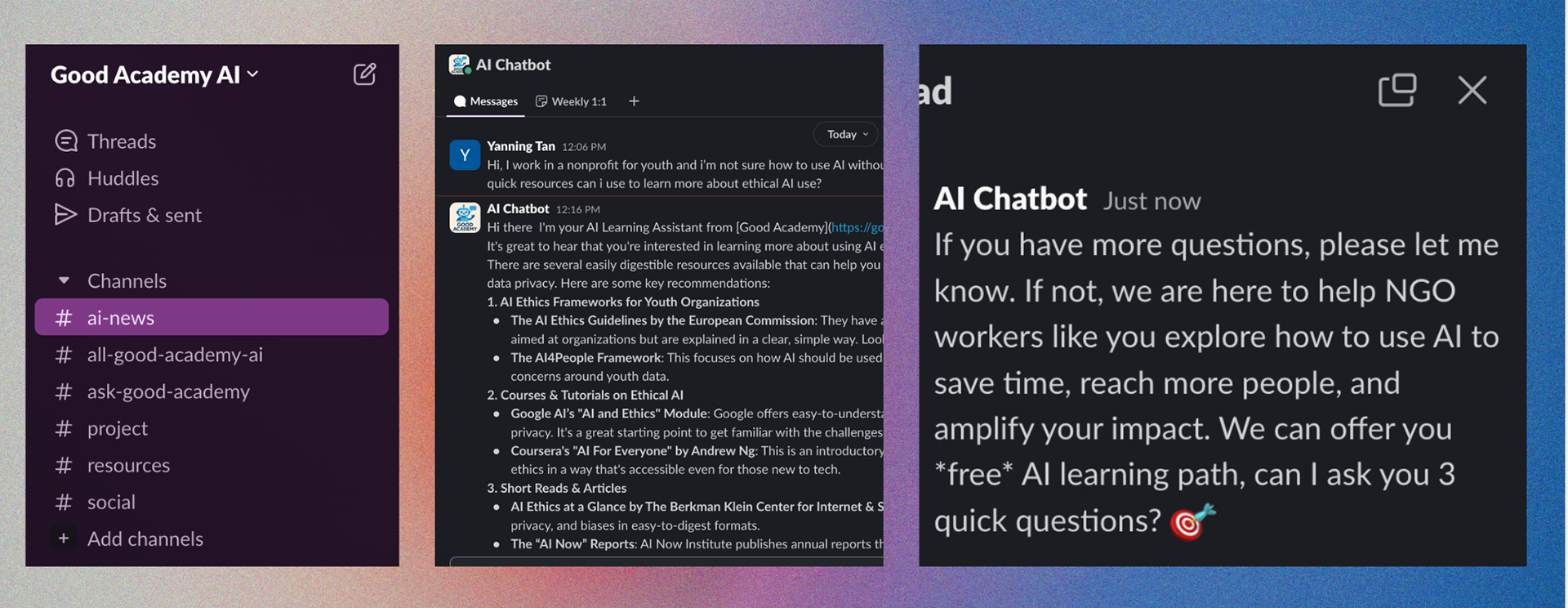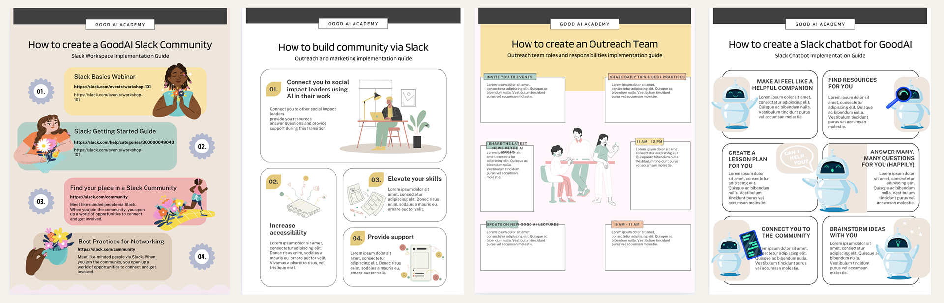A dedicated Slack ecosystem for the Good AI Academy community members that features various forums for questions, collaborations, advice, and innovation. The Workspace is moderated by a Good AI Community Liaison as well as a Good AI chatbot. Between the human and AI-assisted support, community members have access to trending AI articles, resources, curriculum advice, networking support, and personalized lesson plans.
