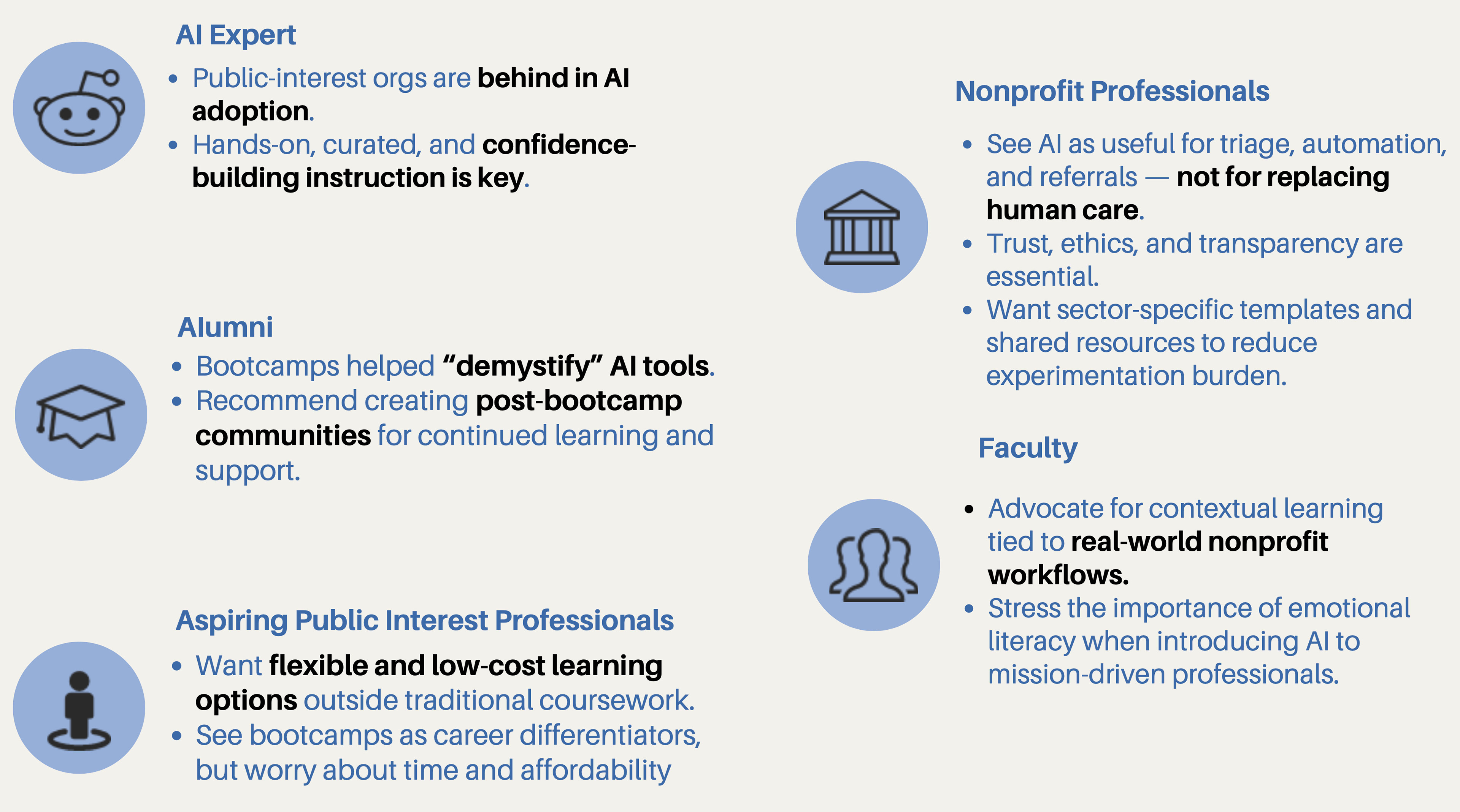 3. Public-interest professionals (Target User): Daily Workflow, AI use in personal/ professional life, Need for AI skills, Problem-solving with AI