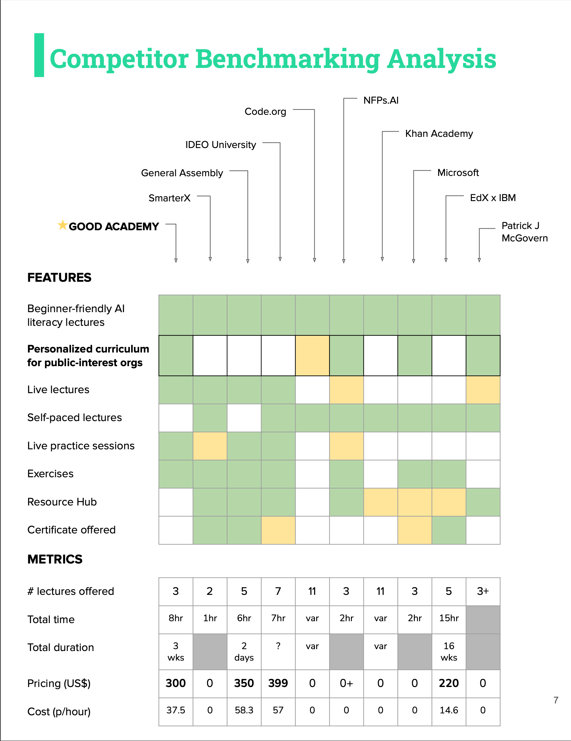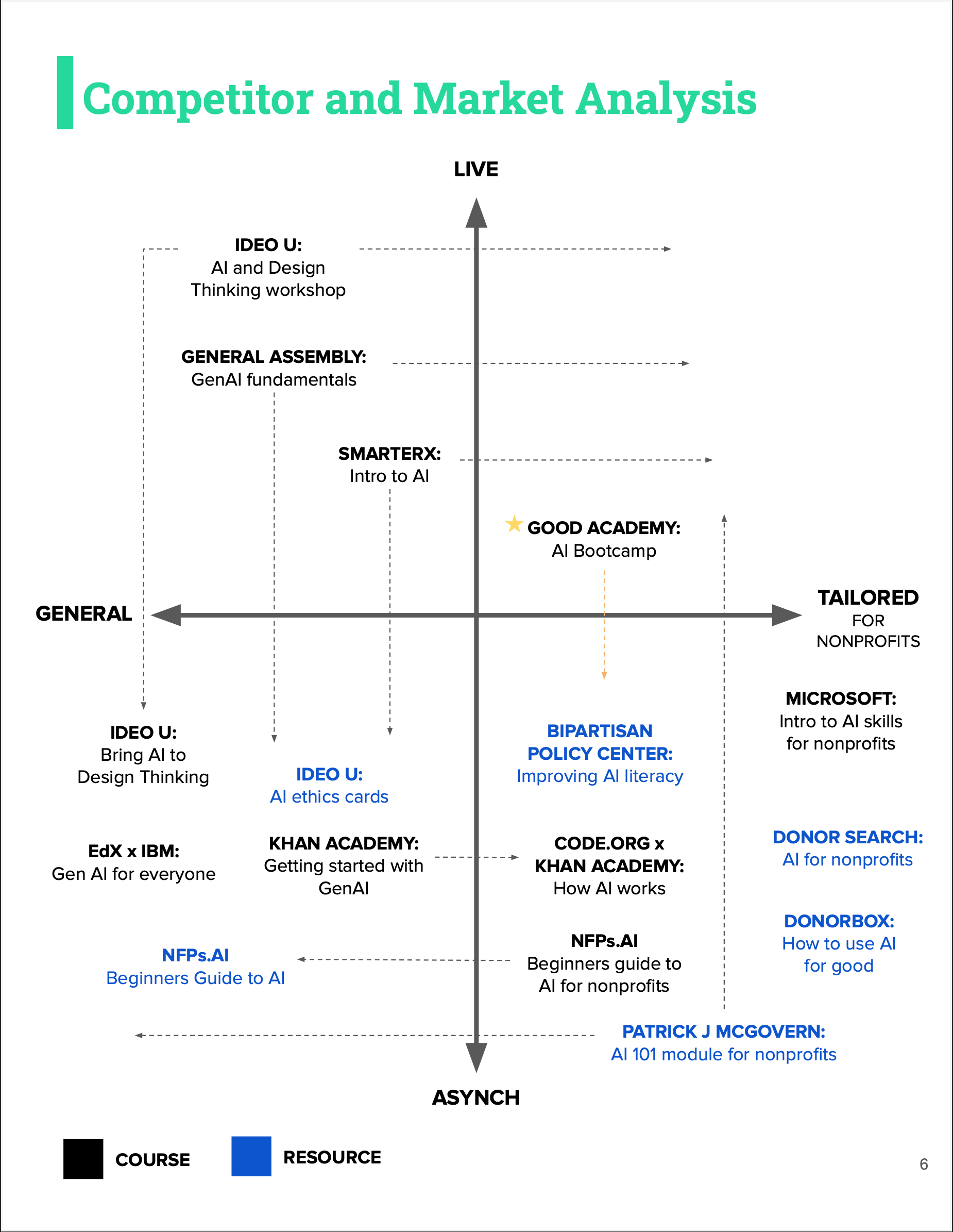 A landscape analysis of 16 competing organizations and a benchmarking analysis of 10 competing products in the current market. Given that Good AI Academy current offering is a live bootcamp series on foundational AI literacy, the primary axes of comparison for the market analysis were the "type of classes" (operationalized as live vs. asynchronous courses) and the "Level of detail/ nuance" (operationalized as "general" vs. "tailored/ personalized for public-interest"). The Benchmarking analysis delved further into the quantity and quality of features that could either provide Good Academy a competitive edge or place it at a position of disadvantage.
